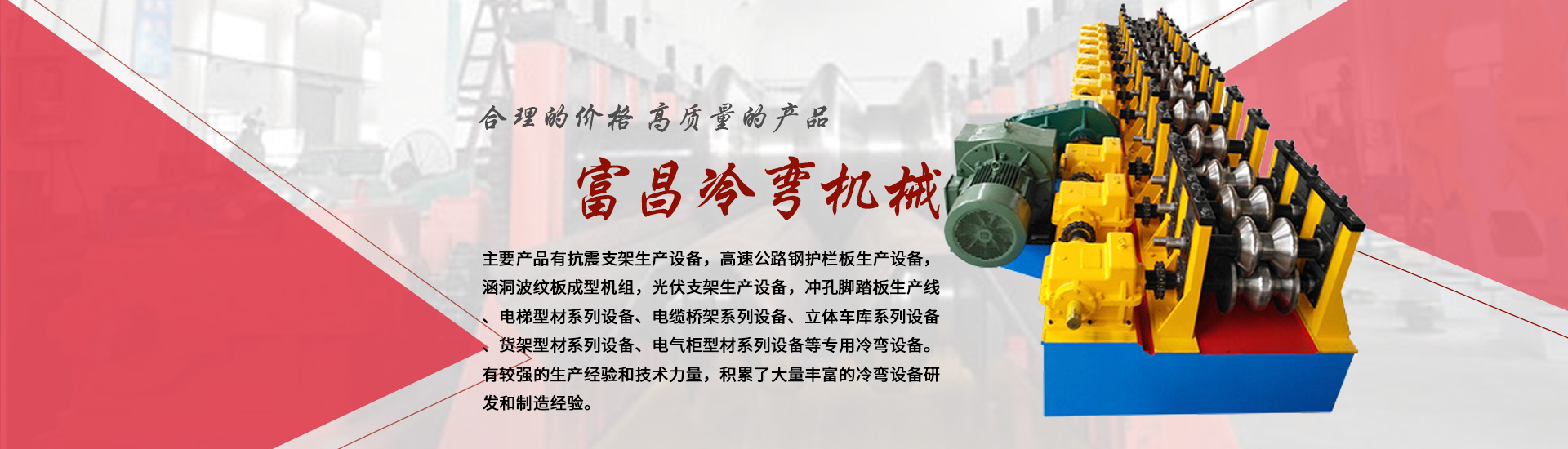 主要產品有抗震支架生產設備,高速公路鋼護欄板生產設備,涵洞波紋板成型機組,光伏支架生產設備,沖孔腳踏板生產線、電梯型材系列設備、電纜橋架系列設備、立體車庫系列設備、貨架型材系列設備、電氣柜型材系列設備等專用冷彎設備。